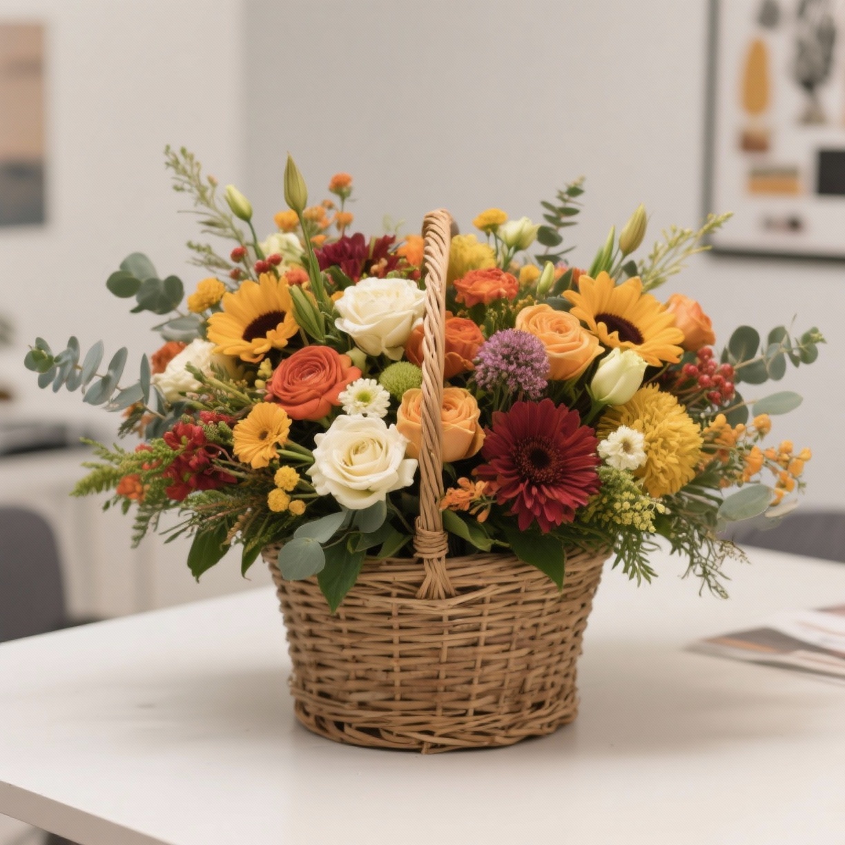 Flores frescas de temporada en cesta decorativa. Ideal para hogar u oficina.