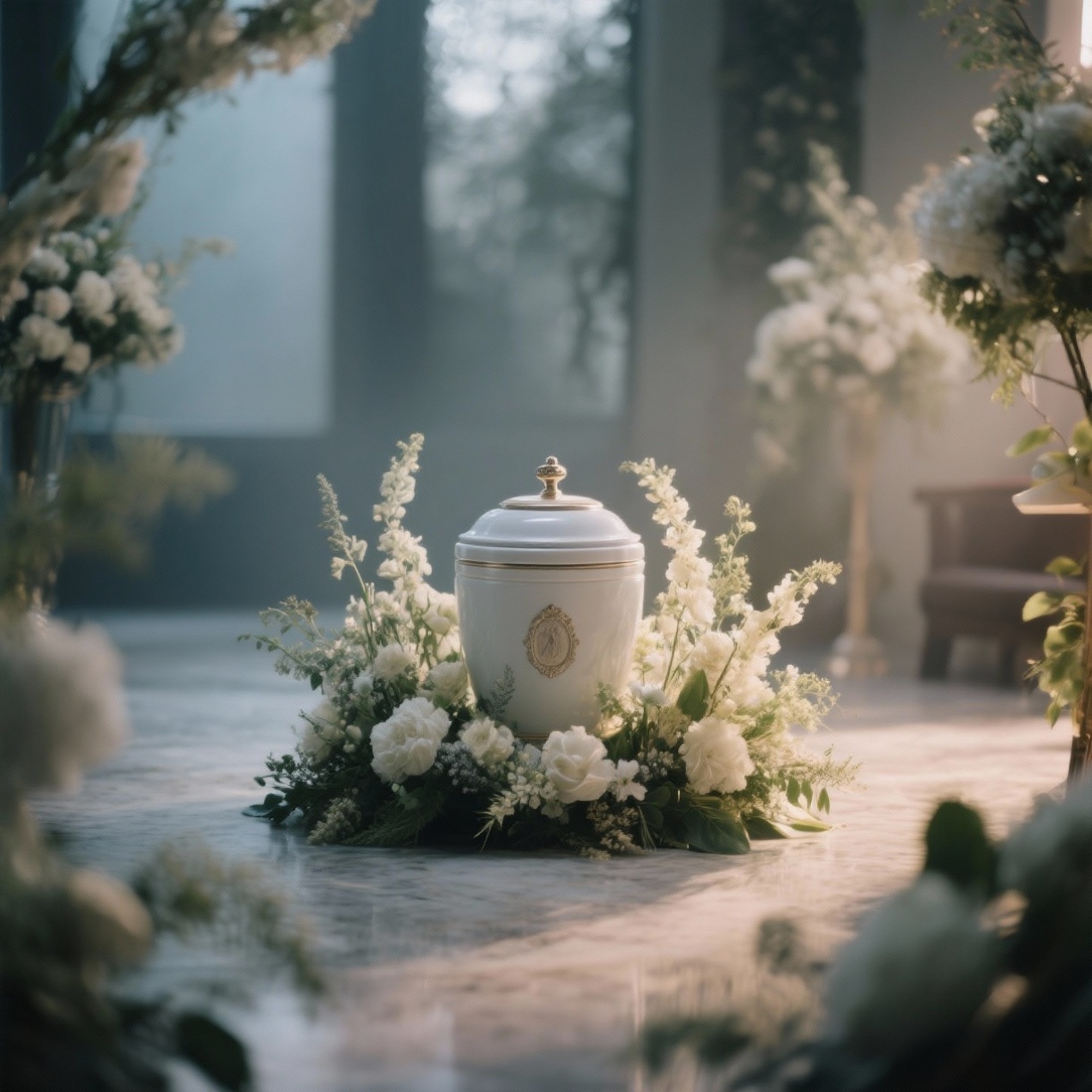 Pequeño centro delicado, ideal para ceremonias íntimas con urna funeraria.