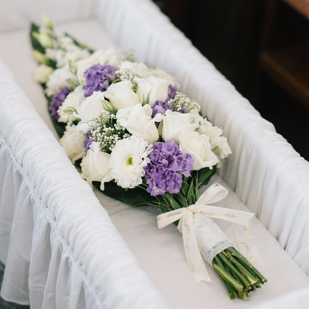 Ramo largo de flores blancas y lilas. Especialmente diseñado para colocar junto al féretro.